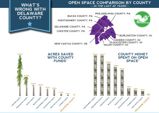 It’s not surprising that outer-ring suburban counties like Bucks, Salem, Gloucester, Chester, and Burlington Counties have saved more open space than other inner-ring counties. These counties lie further afield from Philadelphia, and as awareness of the need to protect open space was gaining traction thirty and forty years ago, they started their open space programs when there was still a great deal of open space available to protect in those counties. In the case of inner ring suburban counties like Delaware, Montgomery, and Camden, we expected to find much less open space protection, and that expectation for the most part proved true. However, Montgomery County surprised us, protecting at least 21,000 acres of land with county bond issues. Camden County’s size and proximity to Philadelphia has certainly affected how much open space there was available to save, but its 2,500 acres of purchased open space is still significant. That leaves Delaware County, alone in the Delaware Valley, as having spent no county money (as far as we could determine) on open space in the last 40 years. Given how little open space Delco has left, this makes absolutely no sense.
